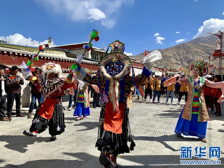 国家级藏戏传承人班典旺久(中)。新华网 达珍 摄