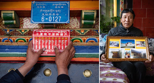 拼版照片:右图为山南市克松社区居民达瓦展示他的“四代”藏式房;左图为达瓦展示新房平安和谐户的牌子(2020年3月12日摄)。新华社记者 普布扎西 摄