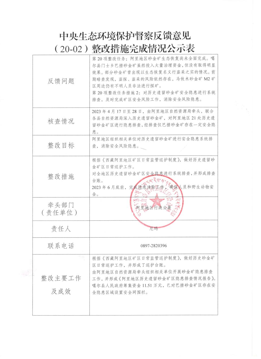 中央生态环境保护督察反馈意见(20-02)整改措施完成情况公示表
