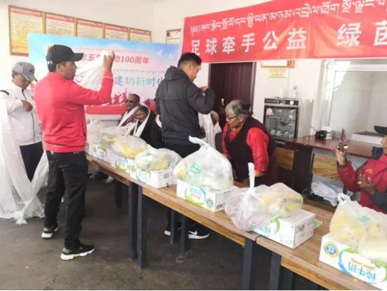 5月18日上午,在普兰县“周末杯”淘汰赛阶段性总绿茵巅峰对决开赛前,团县委、普兰足协代表及各参赛队队员共计15人,到养老院看望慰问老人及工作人员,送去了爱心水果一袋、爱心牛奶一箱;并为辛勤付出的护理员们献上洁白的哈达以表谢意,公益活动最后在整理老人们家务、清扫养老院中结束。