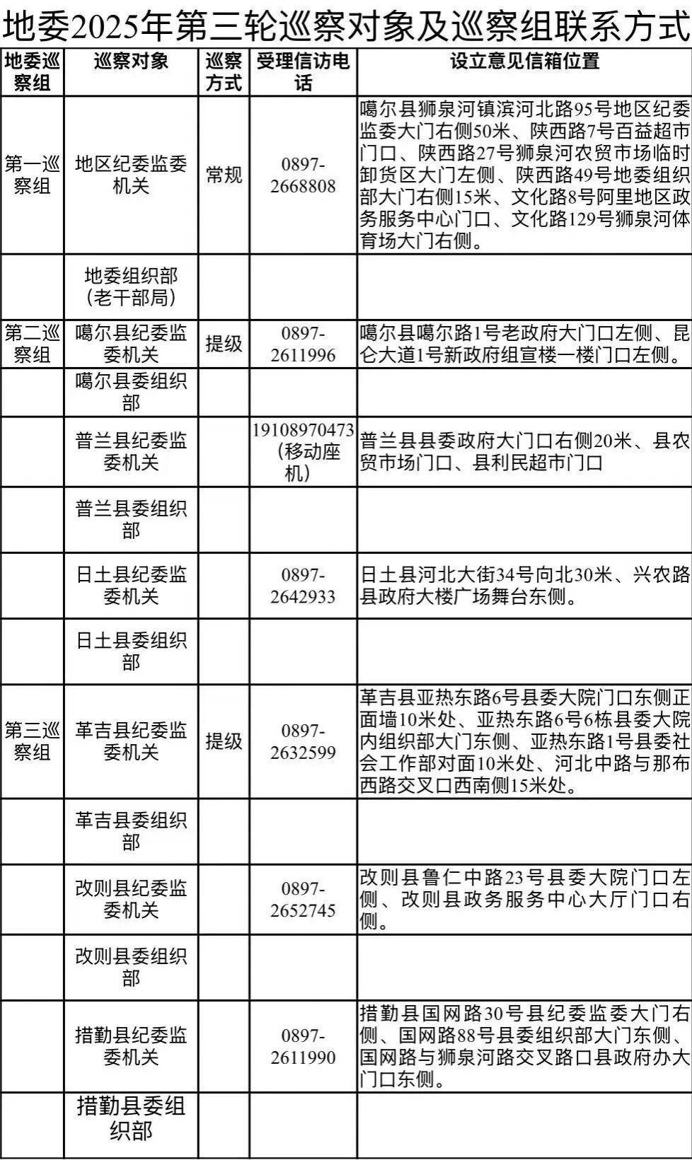 根据地委统一部署,地委2025年第三轮巡察派出3个巡察组,对地区纪委监委机关、地委组织部开展常规巡察;对噶尔、普兰、日土、革吉、改则、措勤6个县的纪委监委机关和组织部门开展提级巡察。截至10月14日,地委3个巡察组完成巡察进驻工作。