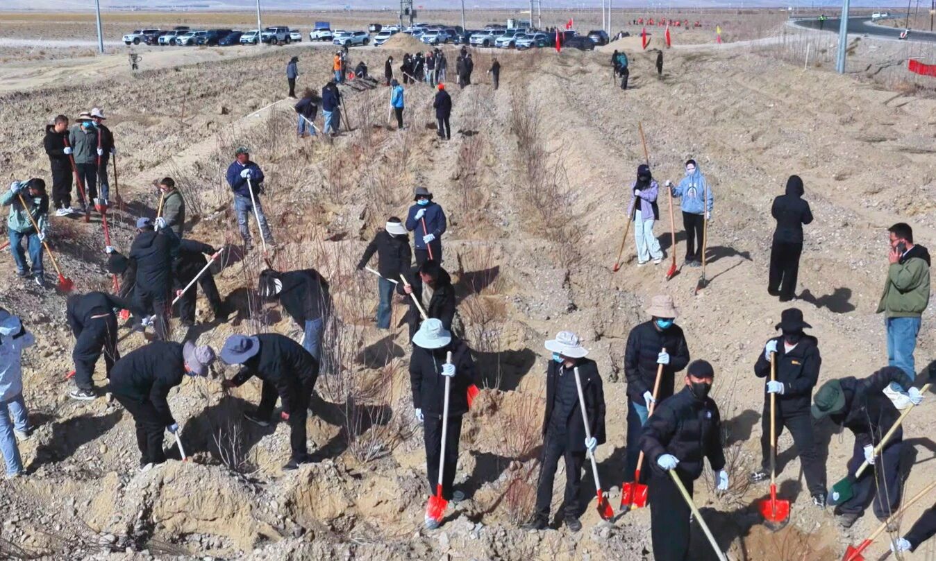 地委、人大、行署、政协和阿里军分区地师级领导同志,地(中、区)直部门干部职工、驻阿部队官兵、离退休干部、中小学生、各族群众、僧尼等4200余人参加义务植树活动。