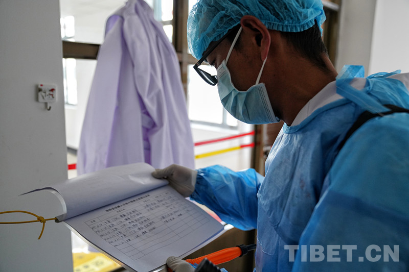 图为强巴次仁认真查看隔离区消毒工作日志。