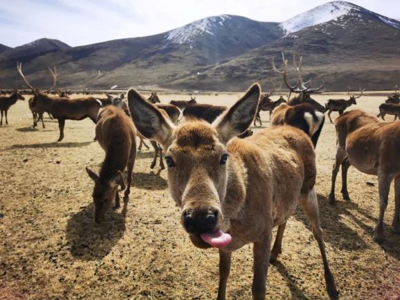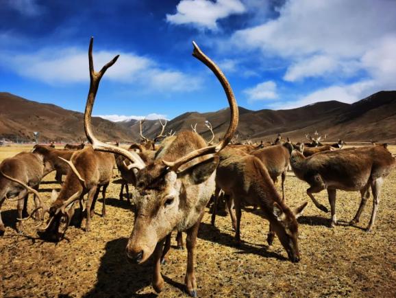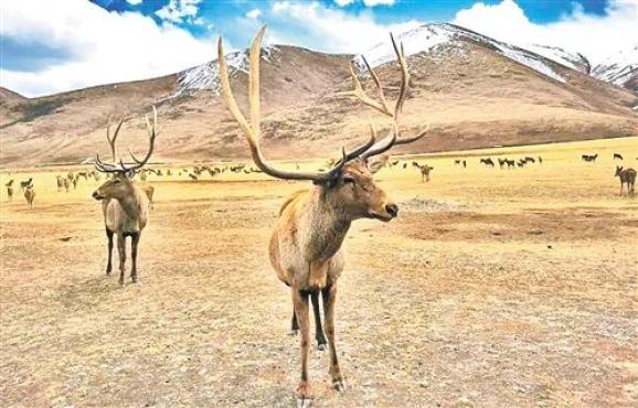 在位于西藏昌都市类乌齐县普琼村的马鹿国家级自然保护区长毛岭管理站,一群马鹿或懒洋洋地趴在草地上晒太阳,或成群结队前去饮用从远处雪山流淌下来的冰雪融水。