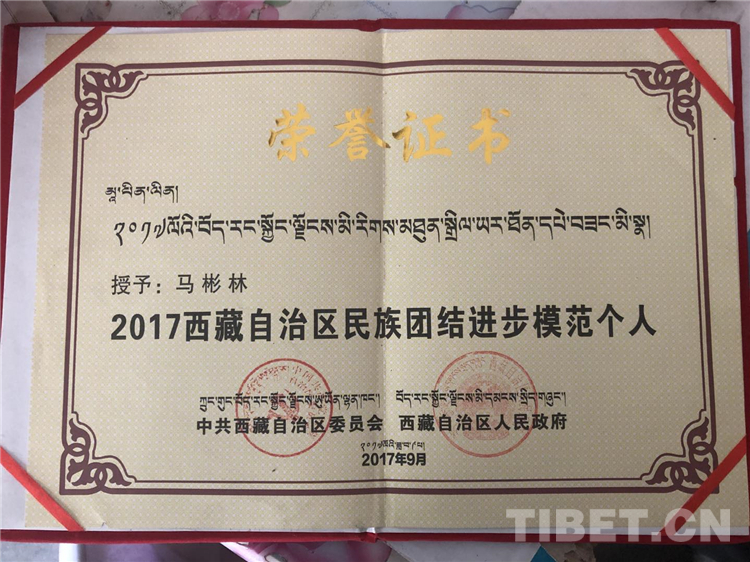 图为马彬林荣获“2017西藏自治区民族团结进步模范个人” 摄影:赵二召