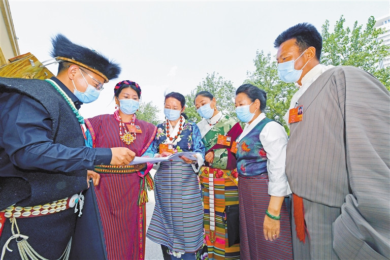 图为会议间隙,我区全国人大代表进行相互讨论。记者 旦增西旦 摄