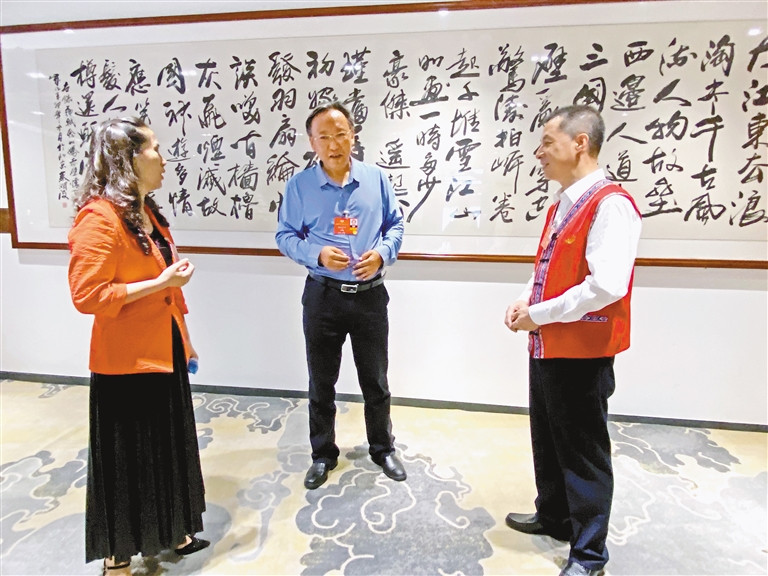 图为我区全国政协委员格桑罗布(中)在会议间隙与区外委员交流。扎门·占堆朗杰 摄