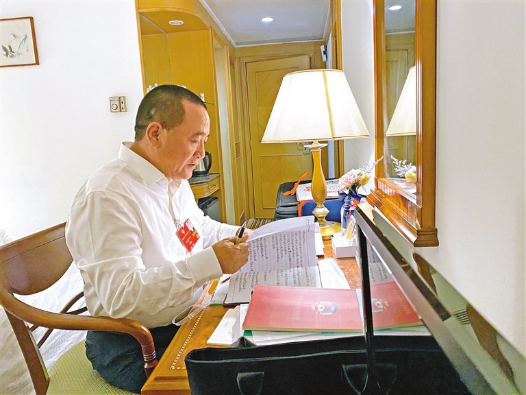 5月24日下午,全国政协十三届三次会议分界别举行小组会议。图为我区全国政协委员洛桑山丹在会前认真准备发言材料。扎门·占堆朗杰 摄
