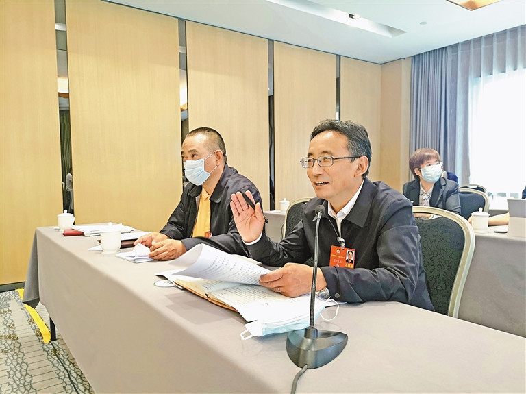 5月22日下午,全国政协十三届三次会议分界别审议政协常委会工作报告和提案工作情况报告,住藏全国政协委员紧紧围绕两个报告,结合我区政协工作实际,在各界别小组讨论中积极履职建言。 图为我区全国政协委员图登克珠在发言。(图片由住藏全国政协委员提供)