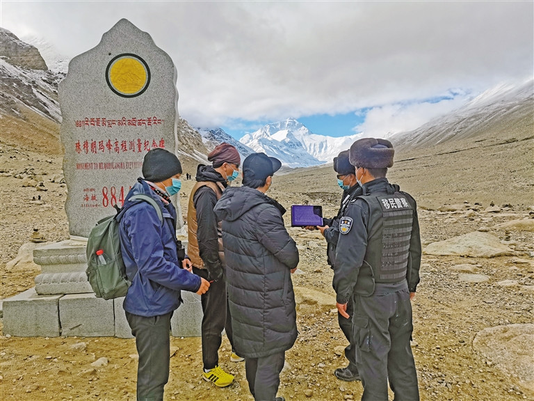 全国两会期间,我区各族干部群众纷纷通过电视、广播、网络等媒体收听收看大会盛况。图为5月22日,珠峰边境派出所民警在珠峰大本营同游客一起通过手机关注两会。记者 王雪 通讯员 马华亮 摄