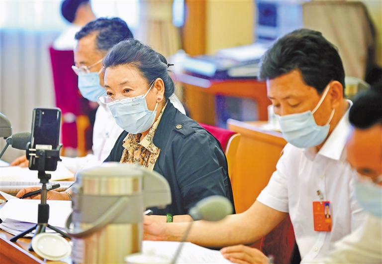 5月24日上午,十三届全国人大三次会议西藏代表团举行全体会议,审议政府工作报告。图为我区全国人大代表格桑卓嘎在发言。记者 旦增西旦 摄