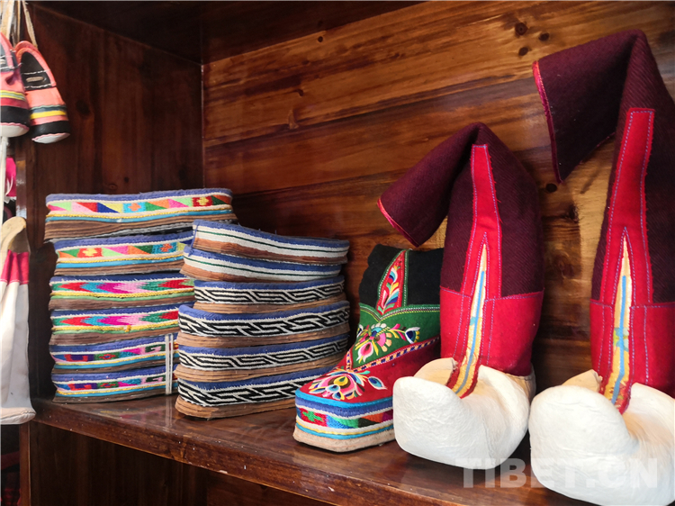 其中最为别致的当属松巴拉姆鞋,其制作材料主要选用氆氇、皮革、纯羊毛等优质材料。改良后的松巴拉姆鞋,皮革来自山东的羊皮,鞋帮的纹饰加工来自苏州,鞋底塑胶来自意大利,整体加工来自广州,最后的手工制作流程在西藏完成。经过传统手工艺人的改良,时尚的松巴拉姆鞋在市场上供不应求。