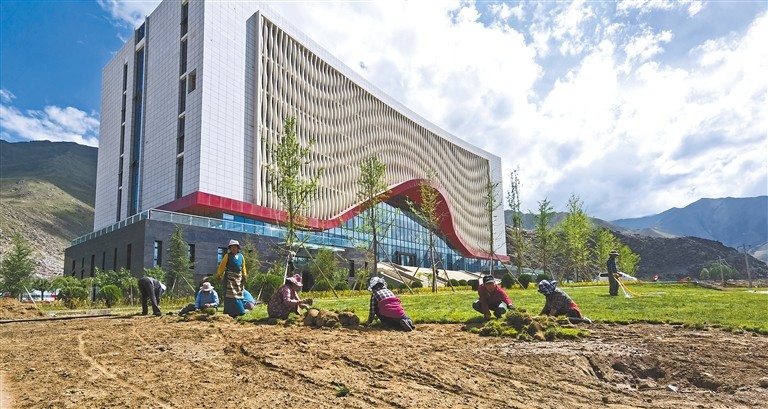 图为综合保税区海关联检大楼前,工人正在进行草皮铺设、园林绿化等工作。记者 潘璐 摄