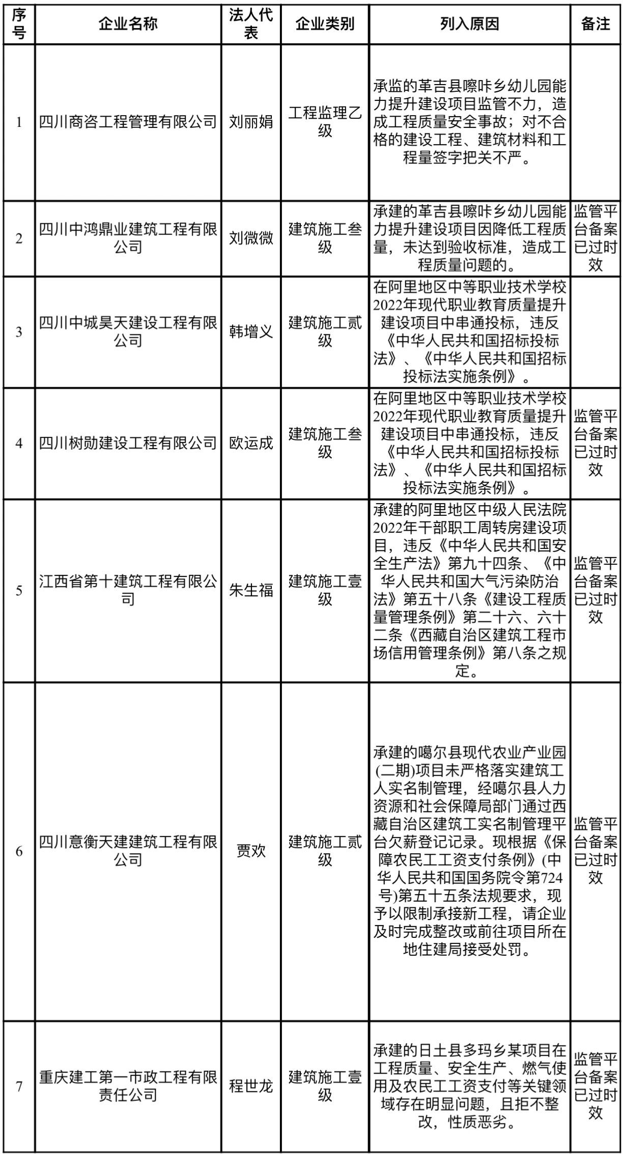 为持续深化阿里地区房屋建筑和市政设施建设领域信用体系建设,严厉打击违法违规行为,规范建筑市场秩序,依据《国务院关于建立完善守信联合激励和失信联合惩戒制度加快推进社会诚信建设的指导意见》《西藏自治区建筑市场管理条例》《保障农民工工资支付条例》等相关规定,结合各级住建部门日常监管、项目核查及企业违法违规行为处理情况,现将2025年度第三批建筑企业“黑名单”“不良行为记录”名单及截至本公告发布时的现有红黑名单、不良行为记录企业汇总名单予以公布。