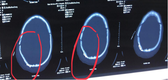 一名年仅9岁的女患者,以外伤后意识不清2小时代诉入院,入院查体:浅昏迷,有顶部约5mm头皮挫裂伤,可触及颅骨凹陷,左外耳道有血性液体流出,左侧周围性面瘫,CT片示,右顶骨凹陷性骨折,左颞骨骨折,颅内积气。当时患儿烦躁。陕西第五批组团医疗队赵岳峰副主任医师看过患者后,分析病情,患者凹陷骨折超过1cm,手术指征明确,需要做颅骨整复术,因本院从未做过此类手术,无钛连接片,术中将颅骨取下无法连接整复,无法固定,遂决定密切关查病情,若无进展,可暂时保守,择期手术。当天晚上和第二日复查头颅CT患儿,病情无进展,德吉卓嘎医生积极与医院协商紧急进购钛颅骨连接片及钛钉。