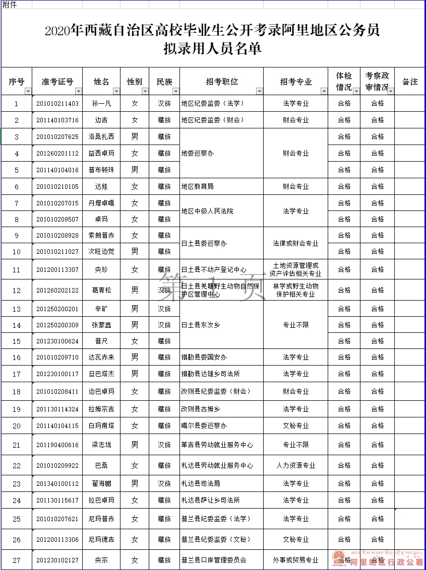 附件:2020年西藏自治区高校毕业生公开考录阿里地区公务员拟录用人员名单