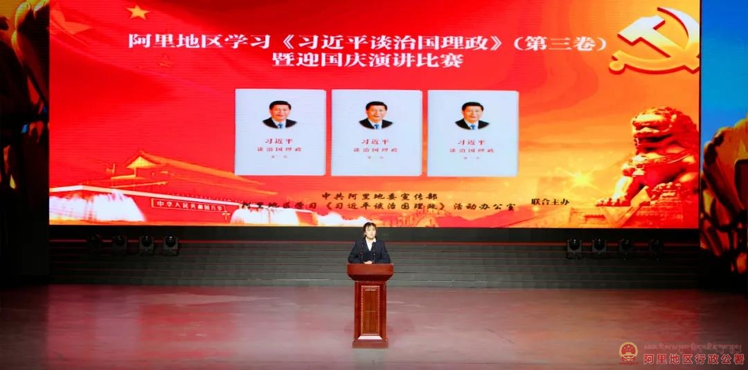阿里地区学习《习近平谈治国理政》第三卷暨迎国庆演讲比赛是在喜迎中华人民共和国成立71周年、全地区全面学习宣传贯彻中央第七次西藏工作座谈会精神之际,举办的“强化理论武装·共庆祖国华诞”活动,通过演讲选手讲述自己和身边人的故事,讲述个人学习《习近平谈治国理政》第三卷所思所悟所感所获,抒发爱党爱国的感人情怀,促进全地区广大党员、干部进一步统一思想,全面学、持续学、跟进学,推动学习往实里走、往深里走、往心里走,激励广大党员干部把个人初心、使命担当融入到实现中华民族伟大复兴的实践中,落实到阿里地区稳定发展生态强边四件大事上。