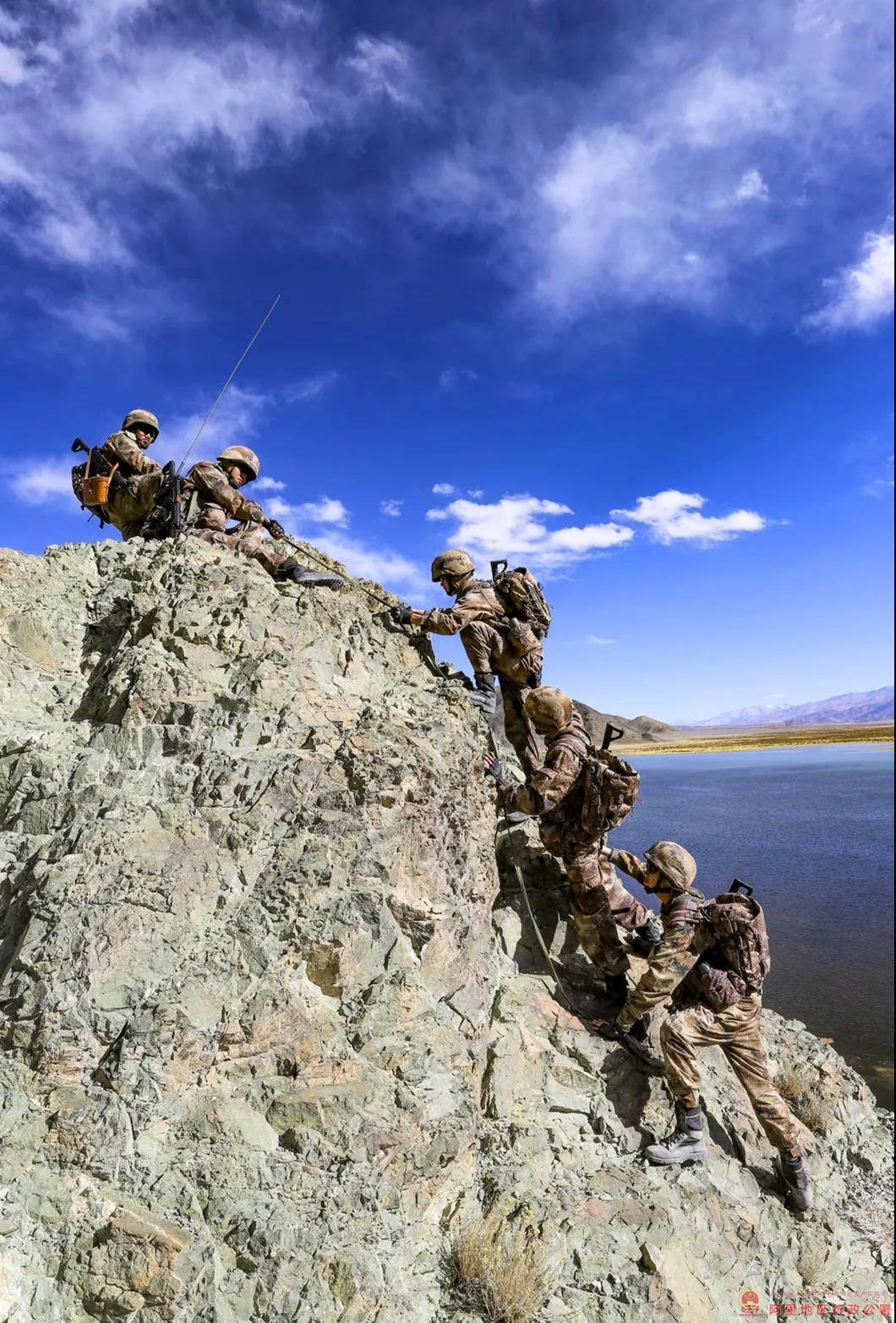 2020年10月1日,阿里军分区某边防团巡逻分队官兵互助攀爬断崖。