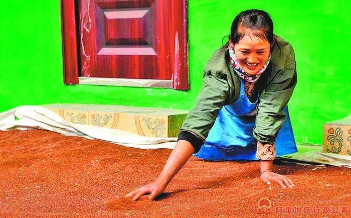 哼着欢快的小曲,双手交替不断拨弄着面前摊晾着的菜籽。不一会儿工夫,藏族姑娘加央金宗便把百十斤油菜籽细致地翻晒了一遍,起身去加工车间忙活其他事情。
