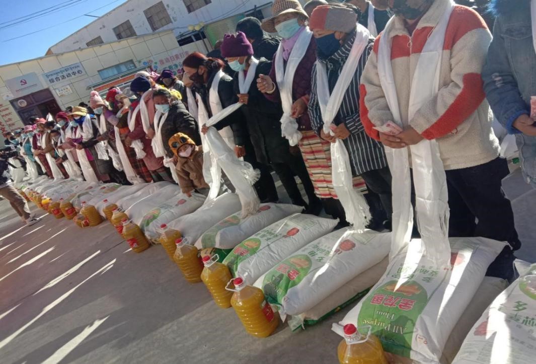 图为产业园区企业将大米、面粉、食用油等捐助物资送到困难家庭手中。旦增卓嘎 摄