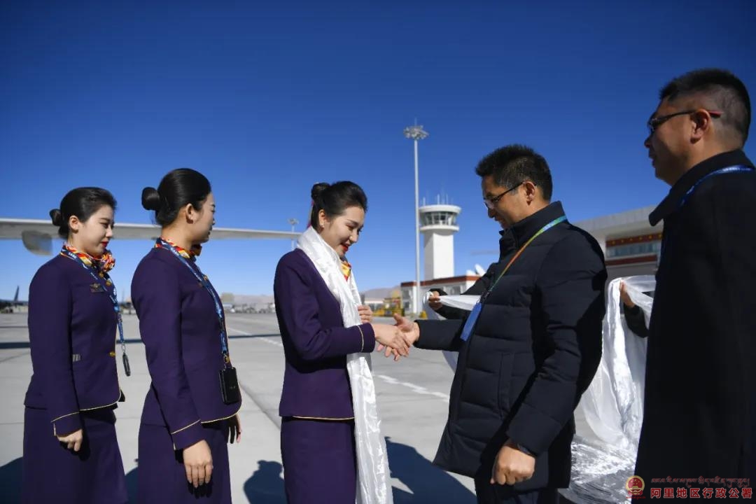 首航仪式上,地委委员、行署常务副专员袁富国将一条条圣洁的哈达献给远道而来的贵客,热烈欢迎机组成员及全体乘客安全抵达。
