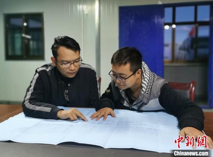 图为金永贵和同事商讨设计方案。(资料图)中国能建甘肃院供图
