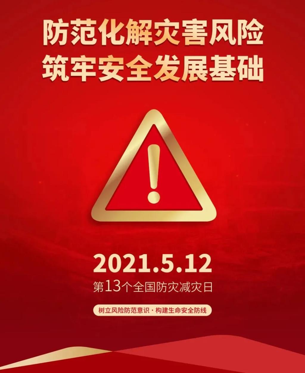 2021年5月12日是我国第13个全国防灾减灾日,5月8日至14日为防灾减灾宣传周。近日,国家减灾委办公室印发通知,明确2021年全国防灾减灾日主题为“防范化解灾害风险,筑牢安全发展基础”。