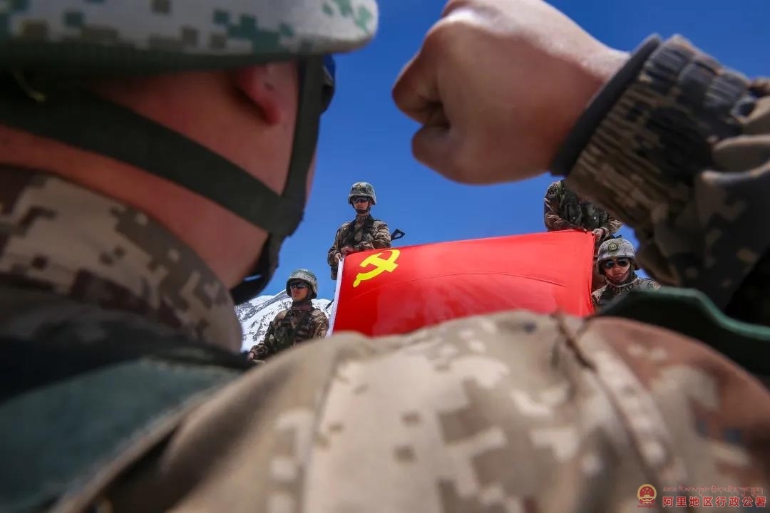 图为7月8日,西藏阿里军分区某边防团巡逻官兵面向党旗庄严宣誓