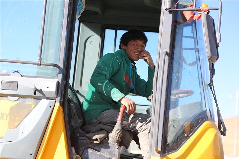 阿里地区措勤县的仁增驾驶推土机参加工程建设。 贺建明摄