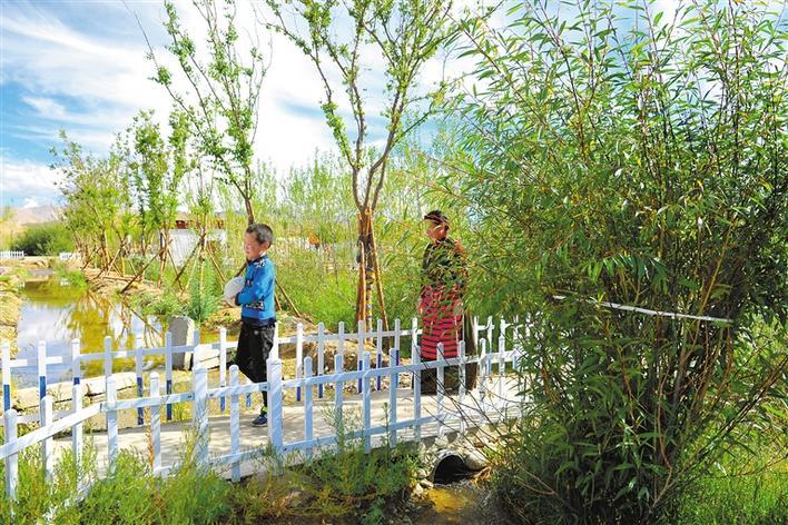 图为阿里地区噶尔县狮泉河镇加木村村民在绿树成荫的村庄里散步。