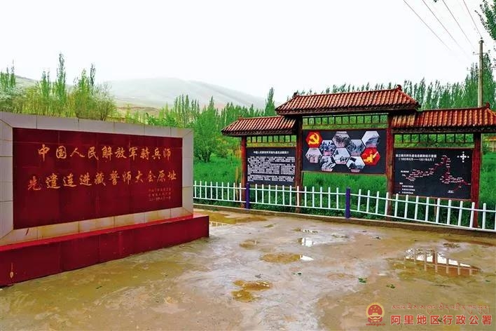 就在村道旁,4米见长、2米多高的红色纪念壁上,“中国人民解放军骑兵师先遣连进藏誓师大会原址”金色大字映入眼帘。墙壁东侧廊柱间,立有“中国人民解放军英雄先遣连进藏简介”、“独立骑兵师先遣连进藏路线示意图”和8张先遣连进藏途中珍贵照片组成的展示牌。