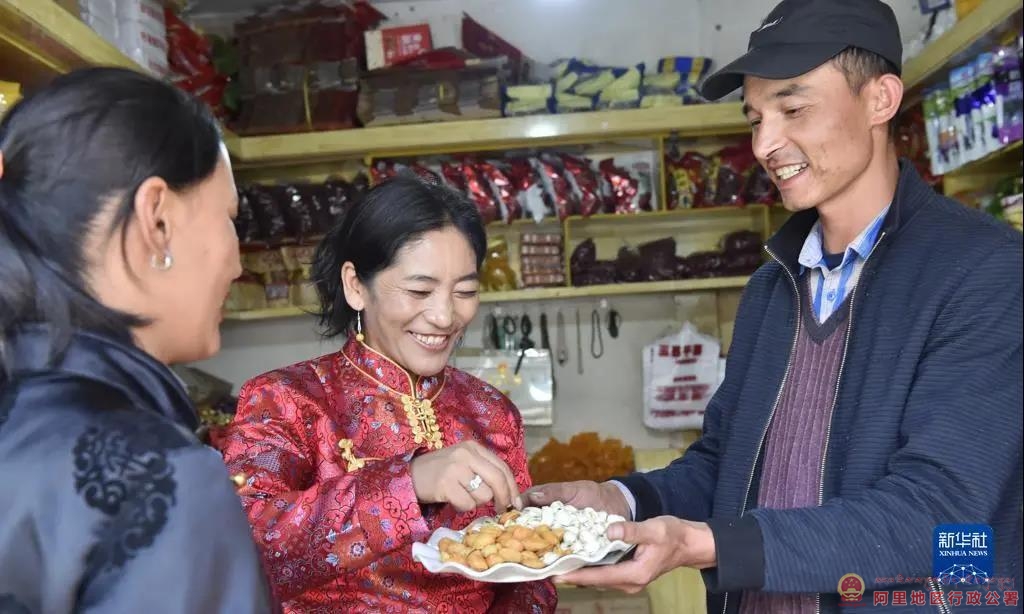 阿卜杜杰力力·麦提如刚(右)于2010年从新疆和田墨玉县来到西藏阿里狮泉河镇做干果生意,并融入到狮泉河镇藏布居委会的民族大家庭中。图为阿卜杜杰力力·麦提如刚请当地藏族朋友品尝来自家乡的特产(9月22日摄)。新华社发(索朗罗布 摄)