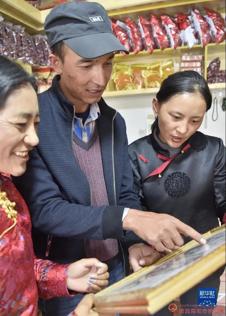 从新疆和田墨玉县来到西藏阿里狮泉河镇的阿卜杜杰力力·麦提如刚(中)给邻居们看自己的家庭合影(9月22日摄)。新华社发(索朗罗布 摄)