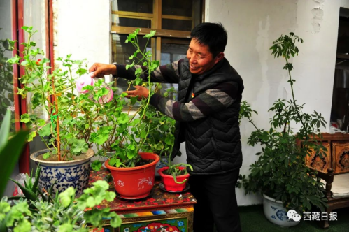仁贡村党总支书记加央次仁正在家中浇花,随着生活条件的改善当地群众也更加注重美化环境,家家户户都种了不少花草。记者温凯摄
