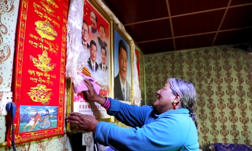 图为仁贡村群众仁青拉姆在易地扶贫搬迁新居里擦拭领袖像。记者温凯摄