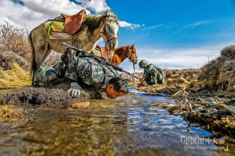 2017年 6月8日,西藏阿里军分区达巴边防连巡逻分队战士边巴(左一)在行军途中饮溪水。
