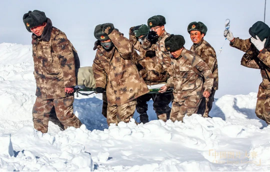 2019年1月28日,西藏阿里军分区西兰塔边防连官兵用担架将突发疾病的战友送到直升机处,准备将他转运至狮泉河镇进行手术。