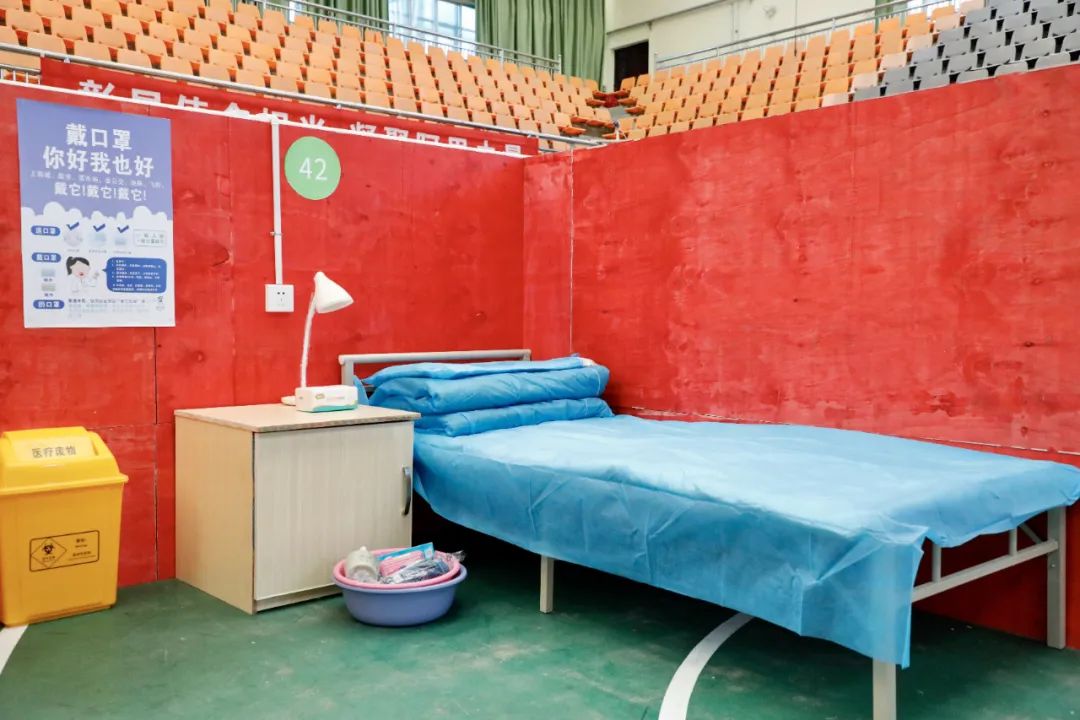 床单、被罩、枕头、洗漱用品、台灯……在现场,记者看到,方舱内基本设施已经全部配备齐全。同时,为了满足患者的解压休闲需要,方舱医院充分利用体育场馆的原有设施,设置了休闲活动区,便于患者舒缓情绪,开展有利于康复的娱乐休闲活动。