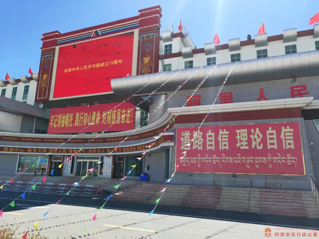 在狮泉河镇文化路、格桑路,在沿街的商铺外,一面面崭新的国旗迎风飘扬,满城的“中国红”不仅是一道美丽的城市风景,更体现着大家一颗颗心怀祖国、热爱祖国、祝福祖国的赤子之心。在各单位门口的电子显示屏上,一行行喜庆的标语循环展播,全社会都在共同庆祝新中国成立73周年,喜迎党的二十大胜利召开。一股奋进新征程、建功新时代朝气蓬勃的气氛弥漫开来。