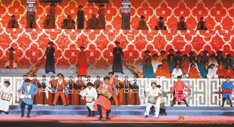 文化旅游节期间,累计举办了三场不同主题的文艺表演,为来宾奉上了精彩纷呈的文化盛宴。开幕式表演分为《悠远古韵》《诗意微芒》《如炬经典》《盛世弦歌》四个篇章,通过绚烂多彩、声情并茂的歌舞表演,配以精心打造的华美舞台和美轮美奂的灯光特效,充分展示了阿里悠久灿烂的历史文化、独具魅力的风土人情,以及当代阿里经济社会发展取得的可喜成就。由自治区党委宣传部和自治区工商业联合会联合主办的“光彩助边”文化行动文艺演出,邀请十余位区内著名歌手登台献唱,一时间天籁回荡,余音绕梁。在首次举办的村居文艺演出比赛中,七县群众先后登台,用独具魅力、精彩纷呈的歌舞表演,展现了新时代阿里百姓幸福安康、踔厉奋发的崭新面貌,彰显了阿里基层文化的大发展、大繁荣。