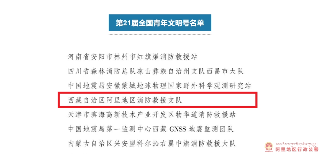长期以来,阿里地区消防救援支队以“老西藏精神”为指引,以“先遣连精神”为标榜,主动对标“国家队”“主力军”职能定位,聚焦“全灾种、大应急”任务需要,紧密结合阿里地区实际,团结带领青年指战员攻坚克难,出色完成了各项急难险重任务,为阿里地区经济社会发展和长治久安提供了坚强的消防安全保障,在平均海拔4500米的藏西高原,镌刻了消防指战员如铁一般的精神。