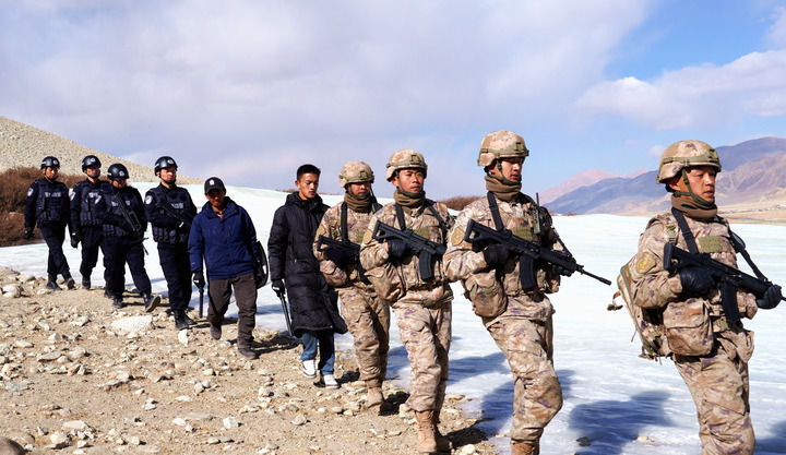 在西藏阿里地区噶尔县扎西岗乡,党政军警民等力量在边境地区巡逻(2024年1月17日摄)。新华社记者 陈尚才 摄