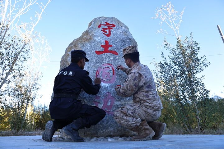 阿里军分区某边防团扎西岗边防连战士和移民管理警察共绘固边石碑(2023年9月27日摄)。新华社发(李思鑫 摄)