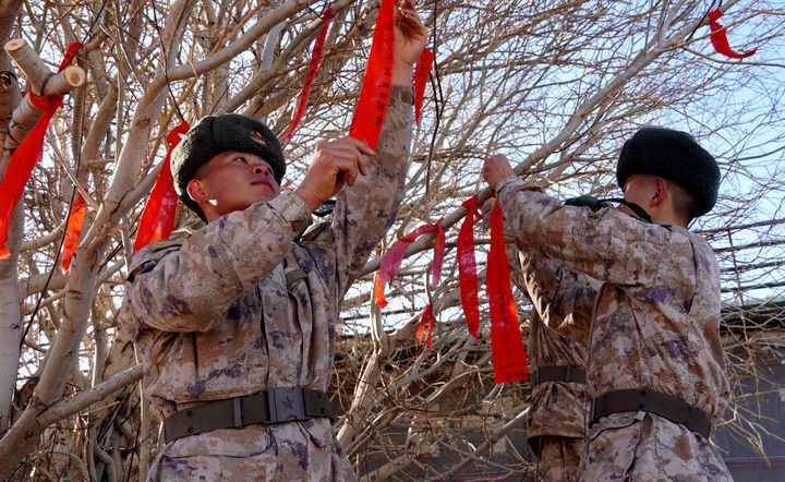 新春佳节来临之际,阿里军分区某边防团扎西岗边防连战士在“先遣柳”前悬挂心愿布带,寄语新年祝福(2024年1月17日摄)。新华社记者 陈尚才 摄