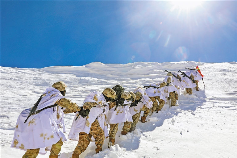 图为近日,阿里军分区某边防团巡逻分队按计划对海拔5200多米的某山口实施巡逻。 记者 次仁平措 通讯员 刘晓东 摄