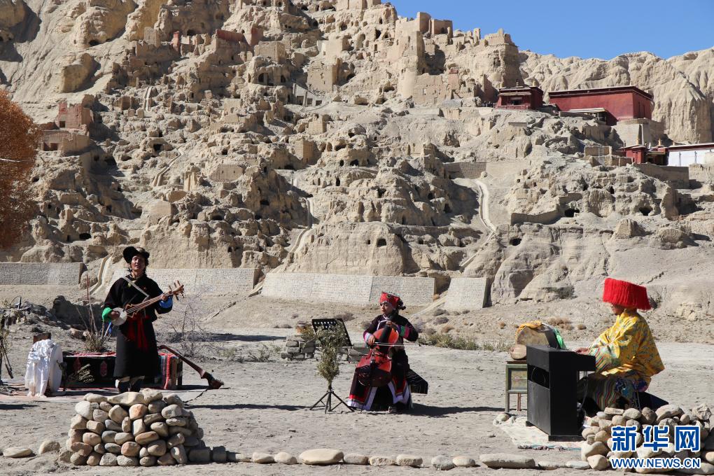 这是11月9日在古格遗址前的演奏现场,右一为乐手格玛扎西群觉。新华社 发