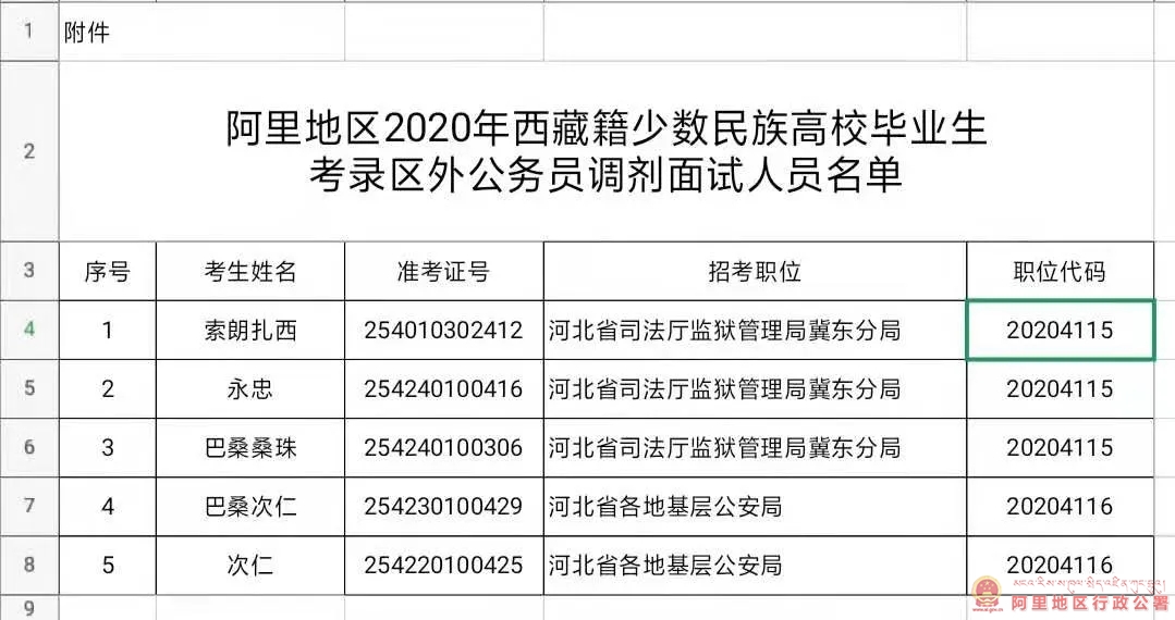 - 名 称:关于公布阿里地区2020年西藏籍少数民族高校毕业生考录区外公务员调剂面试人员名单的公告