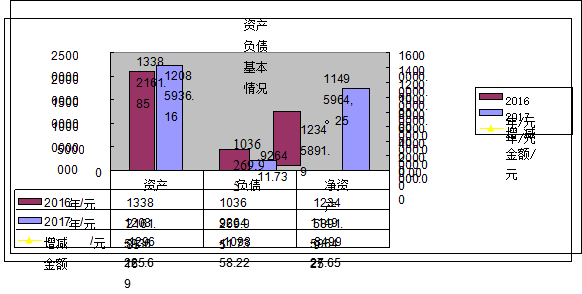 2017年年末资产总额为12085936.16元,负债总额为926411.73元,净资产总额为11495964.25元,与上年相比,资产减少1296225.69元,负债减少109858.22元,净资产减少849927.65元,资产与负债、净资产减少主要是因为处置车辆固定资产。