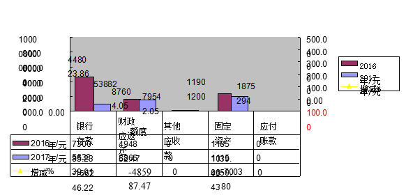 由上图可见,与2016年相比,银行存款减少166246.22元,减少了0.22%,财政应返还额度减少了485987.47元,减少了0.98%,固定资产减少700380元,减少了0.05%。主要是处置车辆减少。