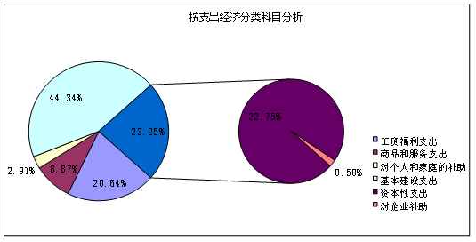 按经济分类科目,工资福利支出71,403.22万元;商品和服务支出40,615.44万元;对个人和家庭的补助12,257.13万元;基本建设支出159,940.58万元;资本性支出63,934.05万元;对企业补助2,078.31万元。